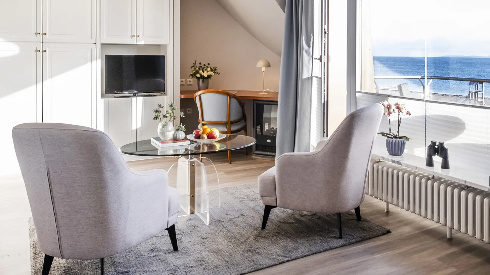 Willkommen in der Juniorsuite „Horizonte“ – Ihrem persönlichen Rückzugsort über den Wellen der Ostsee. Schon beim Betreten spüren Sie es: Dieses besondere Kribbeln, wenn der Blick ungehindert bis zum Horizont schweift, wo Himmel und Meer in einem endlosen Blau miteinander verschmelzen.
